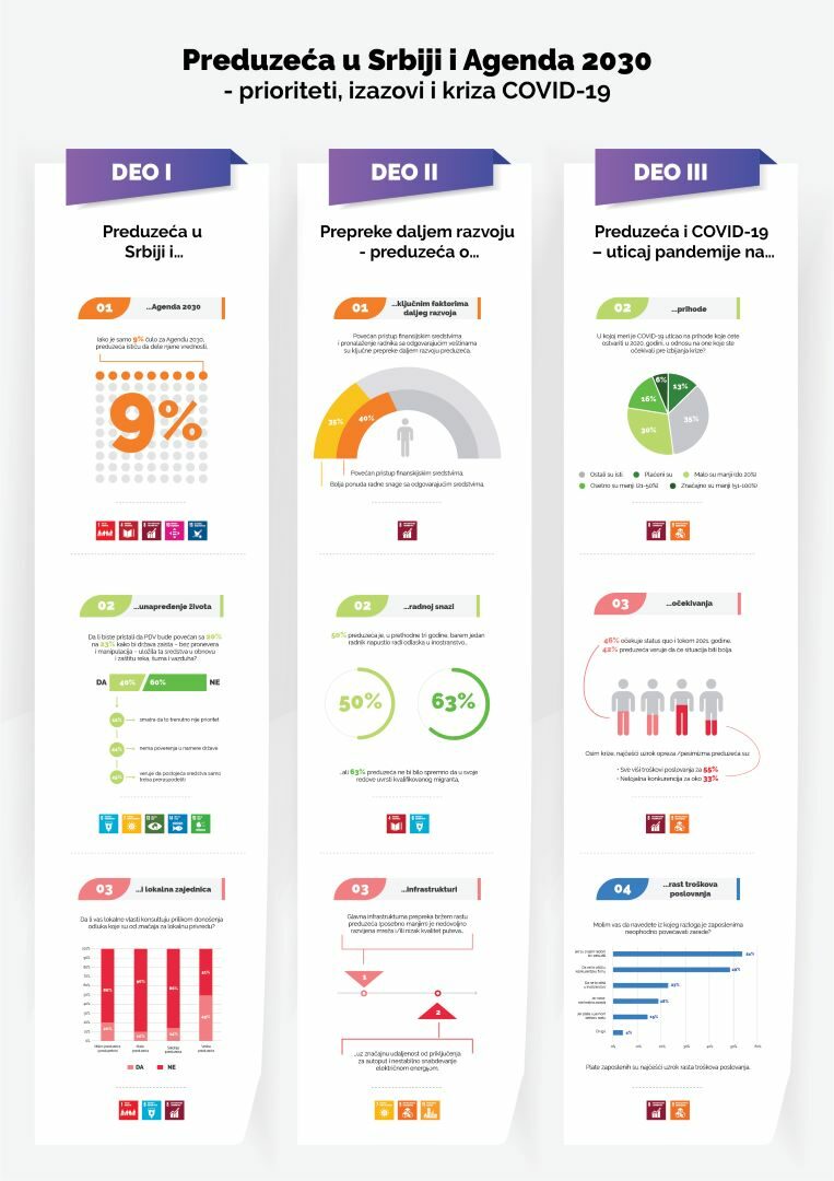 Publikacija pruža odgovore na pitanja o upoznatosti preduzeća u Srbiji sa Agendom 2030, njihovim društvenim prioritetima, preprekama koje stoje na putu njihovog bržeg rasta, kao i uticaju pandemije na njihova očekivanja i poslovanje. Anketa otkriva koje teme i inicijative preduzeća smatraju najznačajnijim za unapređenje života (na lokalnom i nacionalnom nivou) i da li se dodatno angažuju u cilju doprinosa zajednici. Kroz anketu, preduzeća su ukazala na ključne faktore njihovog daljeg razvoja, kao što su stabilan privredni rast, digitalizacija, infrastruktura i nedostatak radne snage koja poseduje odgovarajuća znanja i veštine. Iznela su svoje stavove o uticaju stranih direktnih investicija na njihove lokalne zajednice, ali i pitanjima od globalnog značaja, poput zaštite životne sredine.