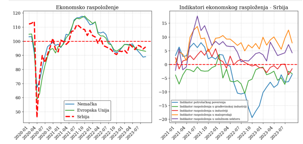 Privredna kretanja u EU vođena su recesijom u pretežno industrijskim privredama – pre svega u Nemačkoj, koja je prešla prag umereno negativnih očekivanja. Navedeni nalazi upućuju na zaključak da bi trebalo zadržati konzervativnost u procenama kratkoročnog rasta Srbije, imajući u vidu da su naša privredna kretanja čvrsto povezana sa onim u EU, pre svega u Nemačkoj.