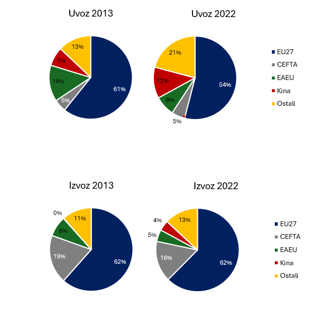 Grafikon 2. Struktura uvoza i izvoza Srbije po zemljama 2013 i 2022
